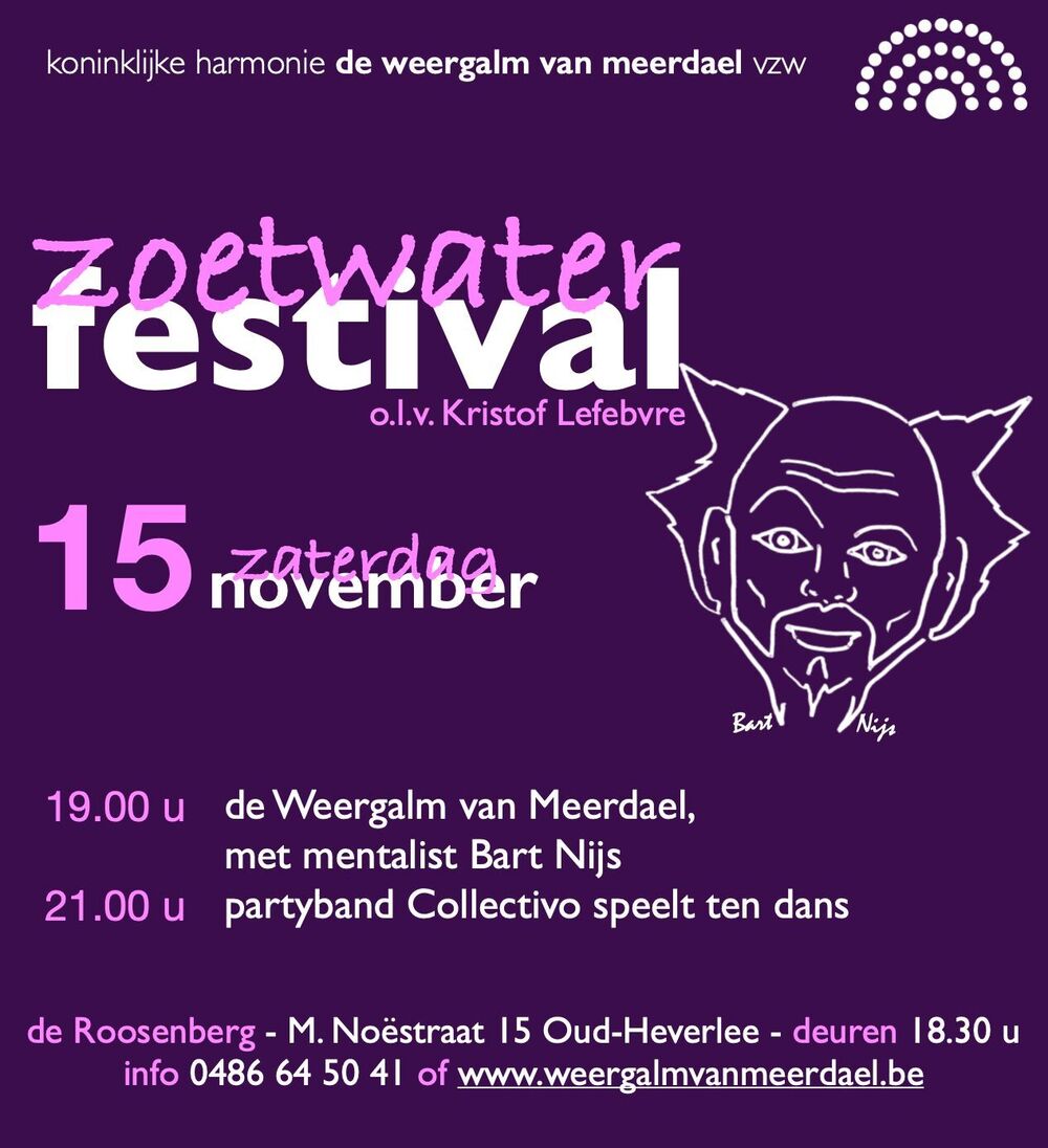Om 19 uur vliegen we erin met afwisselend muziek door de Weergalm van Meerdael en de magiër/mentalist Bart Nijs die het publiek voortdurend prikkelt en op het verkeerde been zet.