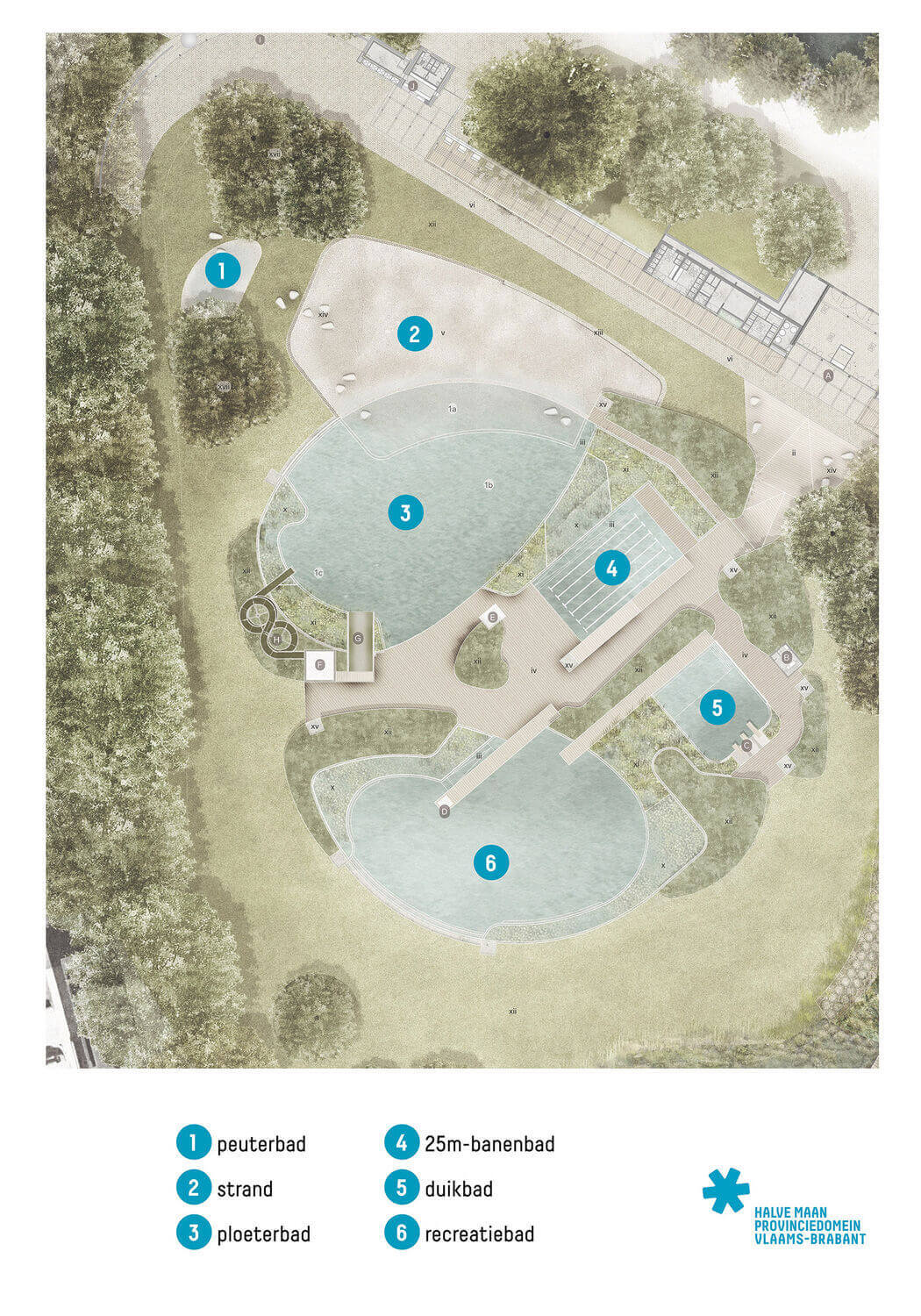De bestaande bomen, heesters, bermen en het amfitheater blijven maximaal behouden. De zwembaden moeten dus aansluiten bij het reliëf van het park. Het nieuwe gebouw, waar onder meer de inkom, kleedkamers en douches ondergebracht moeten worden, wordt opgetrokken in hout en bestaat uit losse volumes onder een grote overkapping.