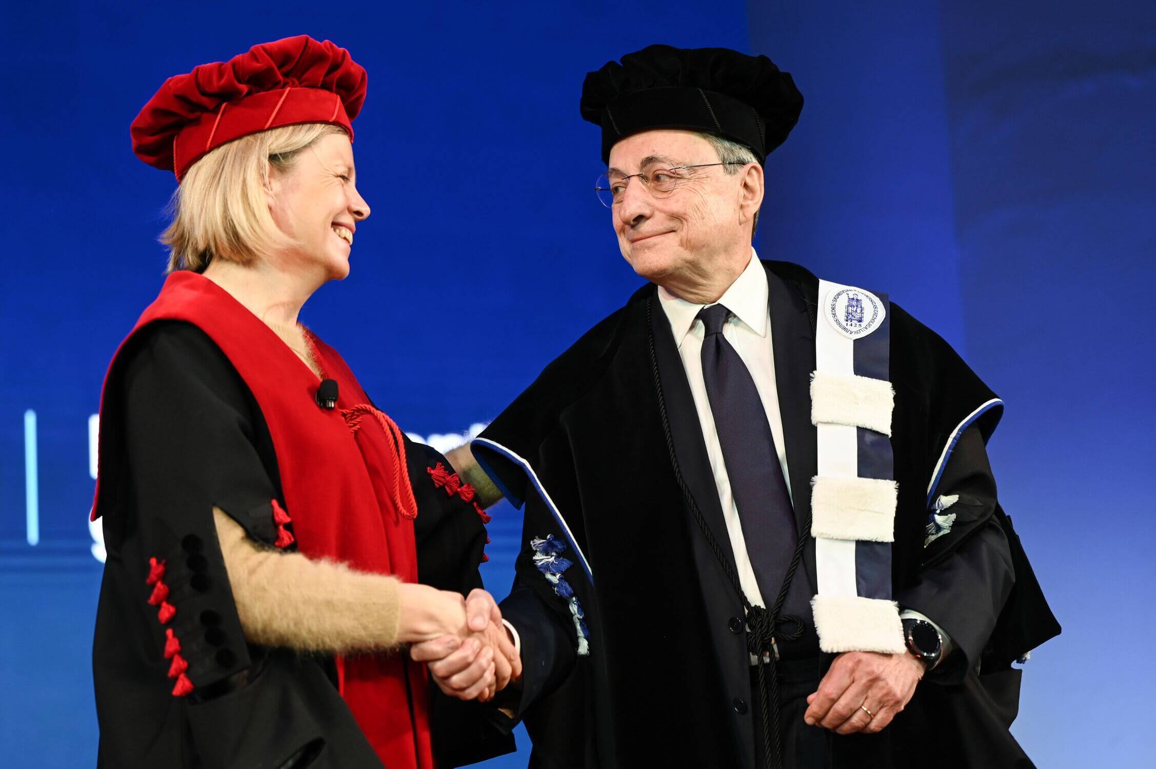Mario Draghi, de ex-premier van Italië en oud-voorzitter van de Europese Centrale Bank, heeft vandaag zijn eredoctoraat gekregen tijdens het Patroonsfeest van de KU Leuven. Hij wordt gezien als een van de meest invloedrijke economen van Europa, nadat hij de eurozone door de schuldencrisis loodste.