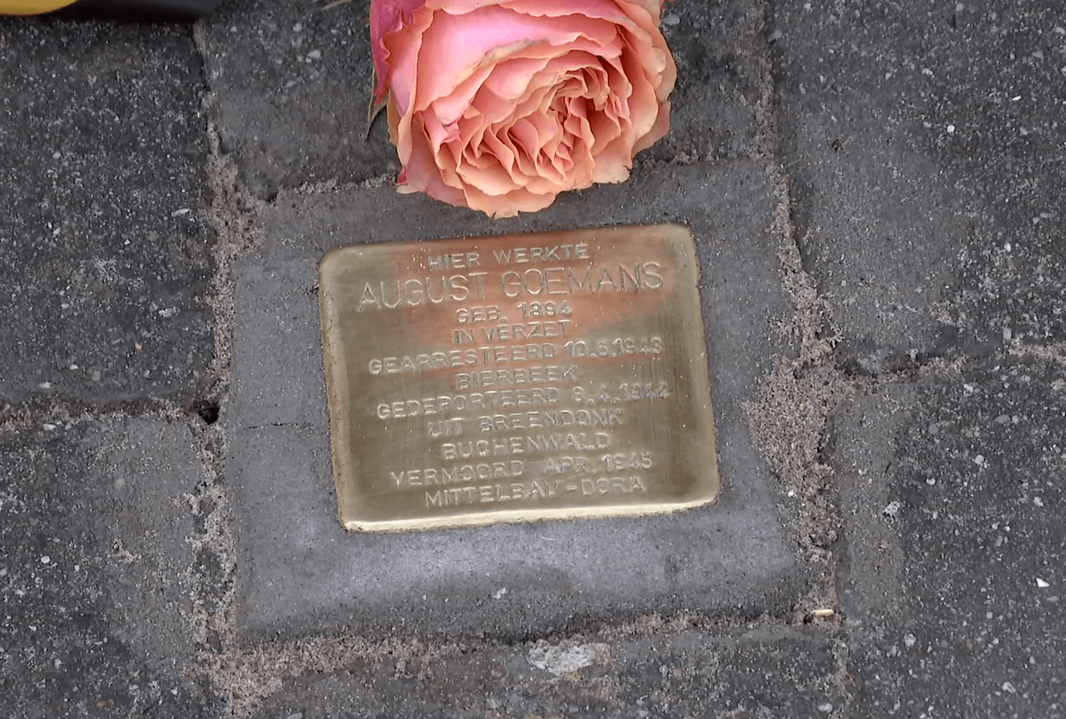 "De steen komt voor het oude gemeentehuis waar in 1943 de oude gemeentesecretaris August Goemans werd gearresteerd door de gestapo. Hij is afgevoerd, verbleef in concentratiekampen en is nooit teruggekeerd." Cil Cuypers (Vooruit), Schepen van Erfgoed