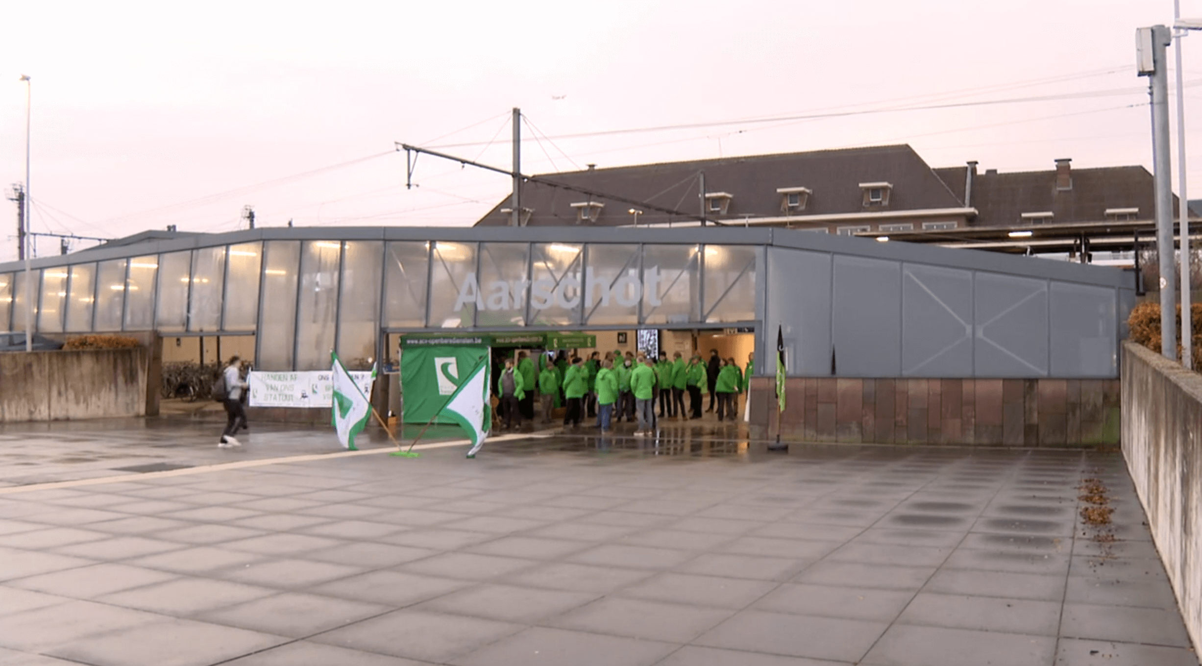 Geen pendelaars tijdens de ochtendspits op de perrons in Aarschot, wel militanten van ACV aan de ingang van het station. Samen met de twee andere vakbonden legt een deel van het spoor- en buspersoneel het werk neer. De algemene besparingen, verhoogde werkdruk maar vooral de pensioenhervormingen zijn een doorn in het oog.