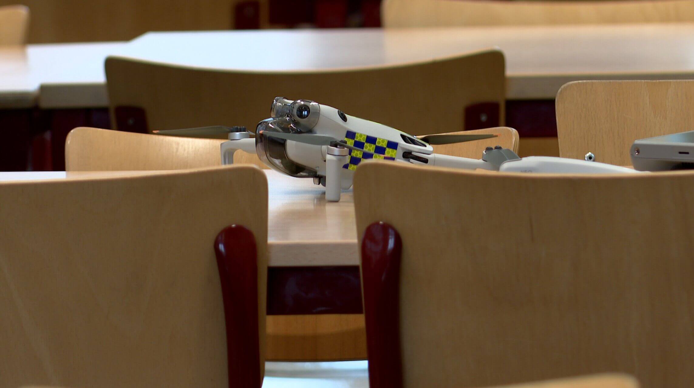 Binnen krijgen de leerlingen al een klein voorsmaakje van wat de toestellen allemaal kunnen. "Ik moest rechtstaan en dan hebben ze drone aangezet", zegt Sophia van Galen. "En dan moest ik een parcourtje afleggen. Ik moest eerst rustig wandelen tussen de tafels door en dan moest ik lopen. En die drone bleef mij achtervolgen. En toen ik klaar was mocht ik de drone op mijn hand laten landen. Dus dan moest ik mijn hand eronder doen en dan kwam die zo rustig op mijn hand.