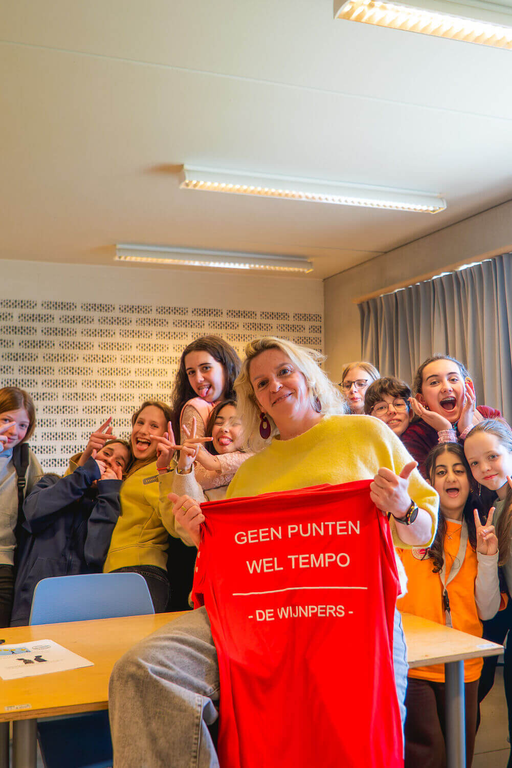 Ondanks een zware inspanning staat mevrouw Massart vandaag opnieuw voor haar leerlingen in middelbare school de Wijnpers in Leuven. Ze is nog volop aan het bekomen van de Leuven Marathon die ze gisteren uitliep.