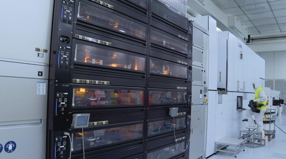 Je komt hier trouwens niet zomaar, alle apparatuur die we mee naar binnen nemen wordt ontsmet en ook zelf dragen we een beschermend pak. Het gaat dan ook om gevoelige technologie die bovendien bijzonder duur is. In totaal kost de nieuwe chiplijn 2,5 miljard euro. Vlaanderen en Europa betalen meer dan de helft.