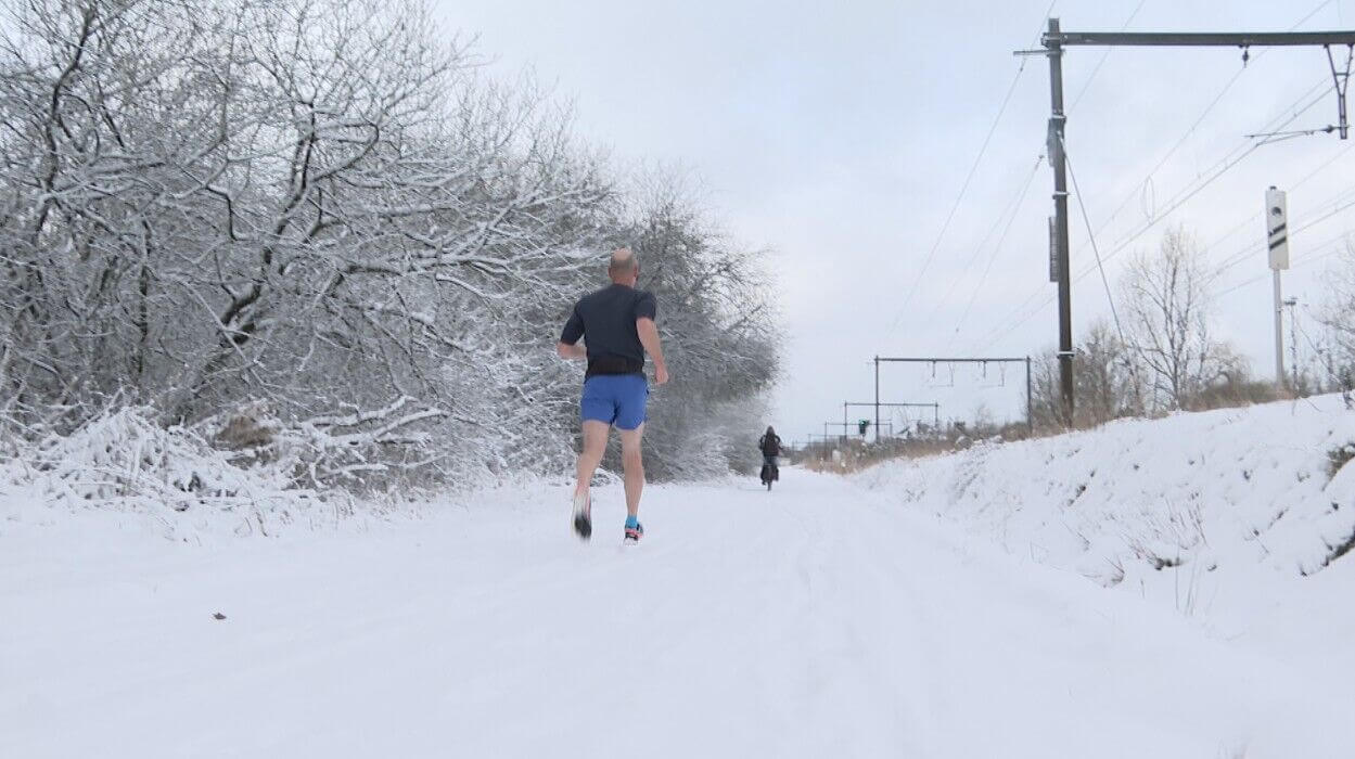 En de sportievelingen, die blijven doorgaan. Sneeuw of niet. "Ik loop vandaag in een korte broek, want dat doe ik niet graag", zegt een loper. "En als je aan het lopen bent is het niet zo koud hé, je krijgt het snel warm dus geen probleem", besluit hij.