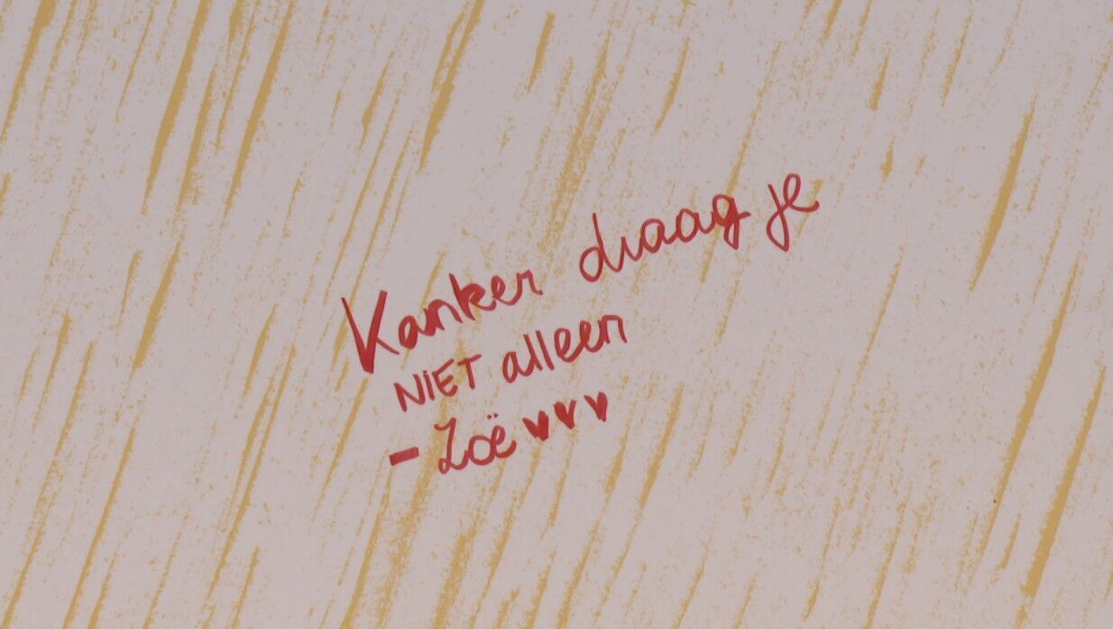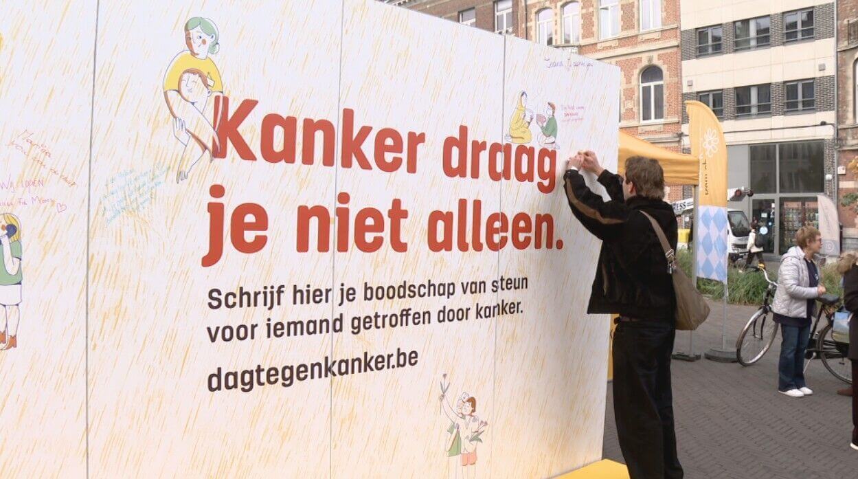 Kanker draag je niet alleen. Dat is de boodschap die de mensen vandaag op het Herbert Hooverplein willen geven. Iedereen wie wil, kan iets op deze steunmuur schrijven, voor zichzelf of voor iemand anders. "Ik heb bij de D iets geschreven, omdat ik een goede vriend heb en die zijn voornaam begint met een D", zegt één van de voorbijgangers. "Hij vecht op dit moment tegen kanker."
