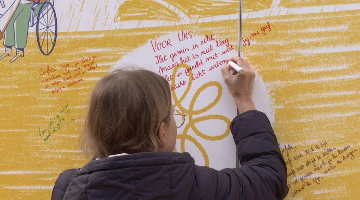 "Wij staan hier omdat wij ook zichtbaarheid willen geven om mensen een warm hart toe te dragen en steun te geven", zegt Nele Piot. "Niet enkel door het te zeggen, maar ook door het letterlijk op te schrijven. Zodat mensen voelen dat we meeleven.
