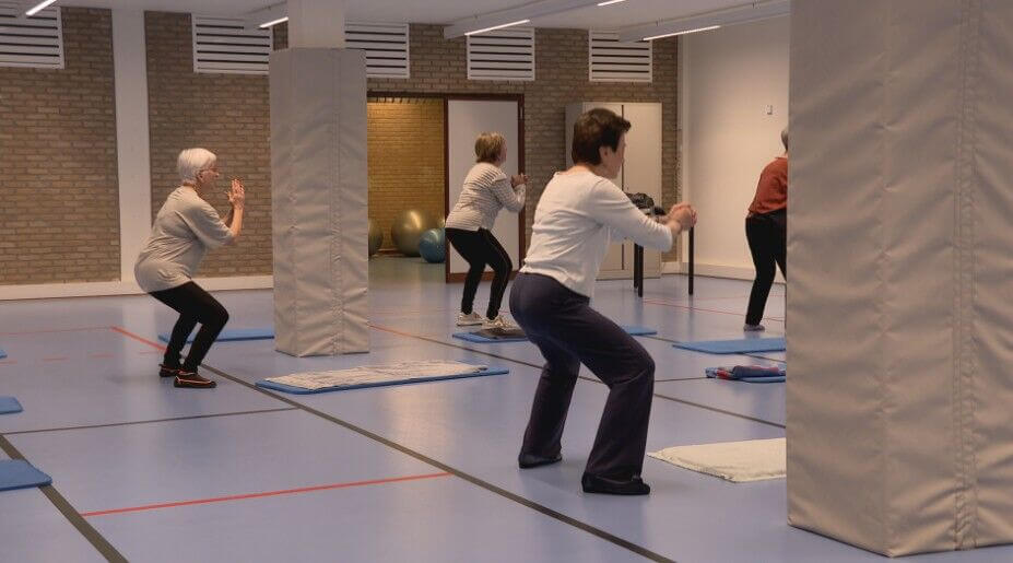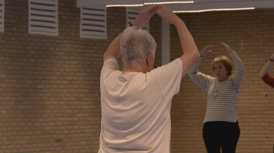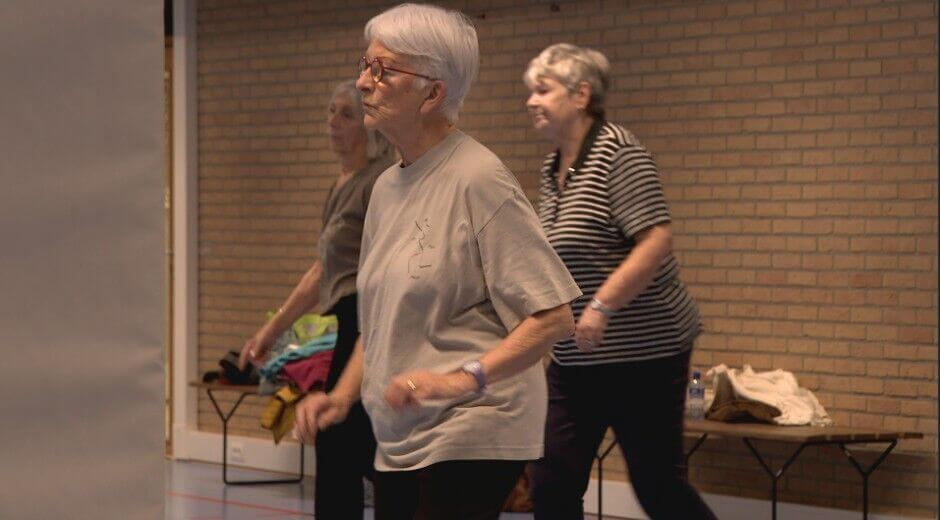 Een vijftiental 55-plussers volgen vanmorgen een les 'Dans je Fit' in het sportcomplex van de KU Leuven. Een goed begin van de dag. "Je blijft soepeler, hé", zegt één van de deelnemers. "Als je de hele dag in de stoel gaat zitten, ja dan wordt je alleen maar stijver. Zeker op onze leeftijd."
